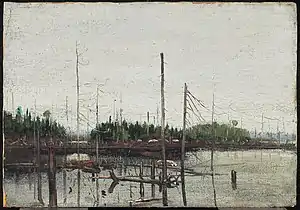 It was in 1912 that Thomson's transition from commercial art towards his original style of painting became apparent.[63][64] This transition appears to have been instigated by his first visit to Algonquin Park in May 1912.[65] He acquired his first sketching equipment,[56] but spent most of his trip fishing,[66] save for "a few notes, skylines and colour effects."[56][67] Dating sketches to this trip has sometimes proved difficult.[68] One exception is the sketch Smoke Lake, Algonquin Park, easily dated because Thomson gave it to Bud Callighen around the time of their first meeting.[69][70][71] Charles Hill has also included the "somewhat awkward" Old Lumber Dam, Algonquin Park as likely being made during the trip.[72] Robson identified Drowned Land as being painted on the Mississagi Forest Reserve canoe trip.[73] Also dated to this time are The Canoe and A Northern Lake (1912).[72]