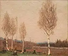 The senior artist at Grip, J. E. H. MacDonald, encouraged his staff to paint outside in their spare time to better hone their skills.[53][54] MacDonald had perhaps the largest influence on Thomson's career as a painter; he enticed Thomson away from the commercial field and brought him towards painting through not only the encouraged weekend outdoor sketching, but through painting trips on holidays and introducing him to his fellow artists.[55] MacDonald himself credited William Broadhead with Thomson's emergence as a painter, writing in a letter to Arthur Lismer that "My memories in connection with Tom seem to begin with B[roadhead]."[56] In a draft of an article, Harold Mortimer-Lamb similarly credited Broadhead with Thomson's emergence.[56][57] Lismer took exception to their claims, instead crediting MacDonald.[58] A. Y. Jackson also expressed that Thomson's major development came after his ventures to Algonquin Park, rather than his time as a graphic designer.[56][59][60] Lismer later wrote,
