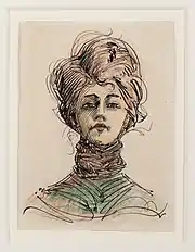 Tom Thomson's first foray into art came in 1901 with his education at Canada Business College in Chatham, Ontario. It was there that he developed rudimentary penmanship abilities.[31][32] By 1902, he had been hired in Seattle at the design firm Maring & Ladd, working as a pen artist, draftsman and etcher.[31][32][33] His main work there consisted in producing business cards, brochures and posters, as well as three-colour printing.[32][33] Having previously learned calligraphy, he specialized in lettering, drawing and painting.[33] Thomson may have also worked as a freelance commercial designer, but there are no extant examples of such work to confirm these suspicions.[34] He was greatly influenced by the black and white illustrations he saw in magazines,[35] something especially apparent in his c. 1903 sketch, Study of a Woman's Head, which draws inspiration from the "Gibson Girl" of American illustrator Charles Dana Gibson.[36] Thomson's younger brother Ralph wrote about Thomson during this period: