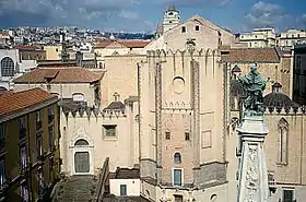 During the reign of Charles II of Anjou (1285-1308), the second Angevin King of Naples, the king's wife, Mary of Hungary, Queen of Naples, was responsible for initiating a number of architectural projects. The most important of these projects was the rebuilding of the Clarissan convent of Santa Maria Donna Regina Vecchia, after an earthquake destroyed the original convent in 1293. In 1307, Queen Mary donated funds to the abbess of the Clarissans for the construction of the new church. The Clarissans, or Poor Clares, were the female branch of the Franciscan Order, founded by Saint Clare of Assisi. The church comprises two levels; on the ground level is a dark, low-vaulted nave and above it is a choir supported on eight columns.[8] The ground level was most likely for the congregation and the upper level reserved for the nuns.[9] A polygonal apse with stained glass lancet windows illuminates the church, contrasting with the dark nave below.[9] By commissioning Santa Maria Donna Regina, Mary of Hungary began a tradition of royal female patronage in the Kingdom of Naples.[7]
