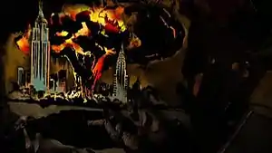 A large explosion and the resulting mushroom cloud in Midtown Manhattan.[15] When Hiro travels five weeks into the future during "Don't Look Back", the explosion happens at 11:52 AM EST on November 8, 2006. This painting is shown as being done on the concrete floor of Isaac's apartment. However, the "painting" is actually a rubberized mat which was originally black-and-white but was replaced with a colorized version so that it would not need to be colorized during post-production.[1] This painting is viewed from Hiro's perspective when he visits the future in "Don't Look Back." | |