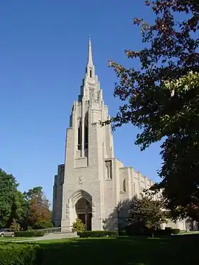 The present church building was constructed in 1953-55 in the American Gothic style. The education wing was added in 1961.[1] The stained glass windows were designed by George Haushalter.[3] The construction and style owes much to the dedication of Dr. Weldon Crossland, minister for 28 years.[4]