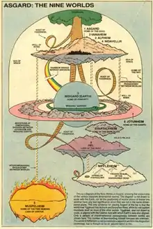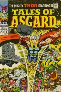 ![]() Cover of Tales of Asgard #1 (October 1968) showing Asgard and some of the inhabitants of the Asgardian dimension. Art by Jack Kirby. | |