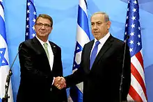 Carter was a supporter of the 2003 invasion of Iraq, as well as an advocate of "preventative" invasions of North Korea and Iran.[48][49][50] In response to increase in tension in Ukraine, Carter considered proposing deployment of ground-launched cruise missiles in Europe that could pre-emptively destroy Russian weapons.[51]