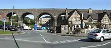 Buxton station having been built as a terminus facing north it was first necessary to proceed around a tight 180 degree curve over the 15-arch Hogshaw Viaduct,[1] with a gradient as steep as 1 in 62, to the station at Higher Buxton. On leaving the town the line passed over 13-arch Dukes Drive Viaduct,[1] and then climbed steadily at 1 in 62 to Beswick's Sidings. The gradient eased from there to Hindlow, where the line joined the CHPR. It then climbed once more at 1 in 60, through the 514 yd (470 m) Hindlow Tunnel,[1] to the summit of the line at Dowlow, a height of 1,260 ft (380 m) above sea level, making it the highest public line in England at that time. This section still exists, serving various lime works at Hindlow and Dowlow.[2]