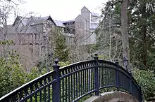In 1851, gold was discovered at Rich Gulch, a tributary of Jackson Creek, and a tent city grew on its banks, today's Jacksonville.[10] Settlers arrived in the Ashland area in January 1852, including Robert B. Hargadine, Sylvester Pease, Abel D. Helman, Eber Emery, and others.[11] Helman and Hargadine filed the first donation land claims in Ashland.[11] Helman and Emery built a sawmill along what was then called Mill Creek to turn timber into lumber for settlers.[11] In 1854, they and another settler, M. B. Morris, built a second mill, Ashland Flouring Mills, to grind local wheat into flour. The community around the mill became known as "Ashland Mills". A post office was established in Ashland Mills in 1855 with Helman as postmaster.[11]