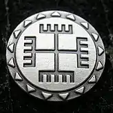 Nowadays, the ashtray from Biała owes its popularity to the drawings of crosses on it. The prevailing view in the scientific community is that the crosses are in fact crossed hands of hunters depicted on the ashtray.[2] Currently, this cross is known as the Hands of God (Polish: Ręce Boga), although such a name does not appear either in sources or in scientific studies. In the 90s of the twentieth century this symbol under the name Hands of God was officially adopted by the circles associated with the Native Polish Church as one of the religious symbols of the Slavs. This interpretation was first proposed by Lech Emfazy Stefański in his book Wyrocznia Słowiańska (Slavonic Oracle) published in 1993, as well as in the statute of the aforementioned religious association. According to him, the large central cross with arms ending in fingers (combs) is supposed to symbolize God Most High, as well as the universe and the balance that nature strives for. The swastikas placed between these arms are supposed to be attributes of Svarog and his son Svarozhits, or the divine causal element[5]. Hands of God is also recognized as one of the religious symbols by another religious association that refers to the ethnic beliefs of the Slavs – the Slavic Faith, registered in 2009.[6]