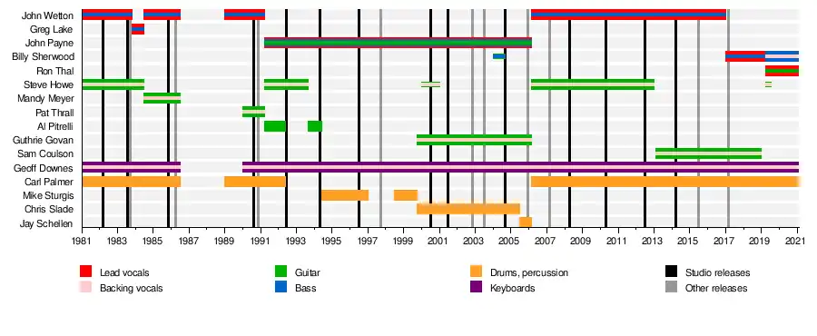 This is an approximate timeline of the members of Asia. Thinner bars indicate guest appearances, either on recordings or live.