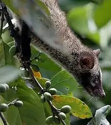 The Asian palm civet is an omnivore feeding foremost on fruits such as berries and pulpy fruits. It thus helps to maintain tropical forest ecosystems via seed dispersal.[6] It eats chiku, mango, rambutan, and coffee, but also small mammals and insects. It plays an important role in the natural regeneration of Pinanga kuhlii and P. zavana palms at Gunung Gede Pangrango National Park.[11] It also feeds on palm flower sap, which when fermented becomes palm wine, a sweet liquor ("toddy"). Because of this habit, it is called the toddy cat.