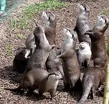 The Asian small-clawed otter is mostly active after dark.[18][19] It lives in groups of up to 15 individuals.[19] In the Bangladesh Sundarbans, 53 individuals were recorded in 351 km (218 mi) of water courses in 13 locations between November 2014 and March 2015. Group size ranged from one to 12 individuals.[20] Group members communicate using 12 or more distinct calls, and utter a variety of yelps and whimpers.[14] When disturbed, they scream to rally the help of others.[21]