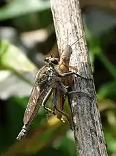 After hatching, robber fly larvae generally seem to live in soil, rotting wood, leaf mold and similar materials, some being predatory and others detrivorous.[5] Larvae are also predacious, feeding on eggs, larvae, or other soft-bodied insects. Robber flies overwinter as larvae and pupate in the soil. Pupae migrate to the soil surface and emerge as adults, often leaving behind their pupal casing. Complete development ranges from one to three years, depending on species and environmental conditions.[6]