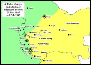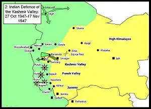 Following the accession of Jammu and Kashmir to India, Indian troops were airlifted on 27 October to repel the invasion. The 1st Sikh regiment of the Indian Army, under the command of Lt. Col. Dewan Ranjit Rai, proceeded to Baramula immediately upon landing. Aslam Khan's "accurate handling of captured mortars" broke their first stand. Col. Ranjit Rai was killed.[12][13] The 1st Sikhs withdrew to Patan where they set up a defensive position. As more troops were flown in each day, the Indians renewed their attack and beat back the invading tribes beyond Uri by 7 November. The Kashmir Valley was secured.