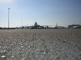 Areas paved with asphalt concrete—especially airport aprons—have been called "the tarmac" at times, despite not being constructed using the tarmacadam process.[13]