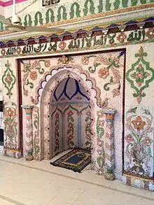Although the mosque was constructed in the colonial period, the structure followed the style of Mughal architecture. It was built as an extremely tall single-storied mosque with great emphasis on the vertical qualities. There are small four domes in the four sides of the roof. A mihrab is located in the western wall, stood from the base of the ground floor to one-third of the height of the first floor. It contains the Shahada written in Arabic calligraphy with glass and stone-flowing Mughal styles. The mihrab's design is made of pieces of glass and stones of five colours; blue, green, yellow (light matte), brown and white.[4] The architecture of the mosque is defined by a combination of embellishments and proportional adjustment among elements such as arches, domes, mihrab etc.