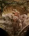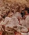 Below the feet of Jesus, the uncorrupt Virgin in red and blue robes is lofted upward by a vortex of singing or otherwise musical angels. Ringing the base of the dome, between the windows, stand the perplexed Apostles, as if standing around the empty tomb in which they have just placed her. In the group of the blessed can be seen: Adam and Eve, Judith with the head of Holofernes. At the centre of the dome is a foreshortened beardless Jesus descending to meet his mother.