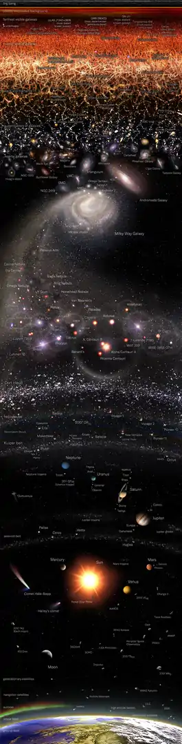![]() Logarithmic representation of the observable universe with the notable astronomical objects known today. From down to up the celestial bodies are arranged according to their proximity to the Earth. ![]() Infographic listing 210 notable astronomical objects marked on a central logarithmic map of the observable universe. A small view and some distinguishing features for each astronomical object are included. |