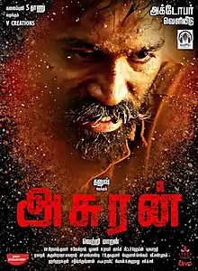 Asuran (transl. Demon) is a 2019 Indian Tamil-language period action thriller film written and directed by Vetrimaaran and produced by Kalaipuli S. Thanu under his production banner V Creations.[2] The film is based on Poomani's novel Vekkai ("Heat"). The film stars Dhanush and Manju Warrier, where the latter makes her Tamil debut. G. V. Prakash Kumar scored the music for the film, renewing his collaboration with Vetrimaaran.[3] The cinematography was performed by Velraj, with editing by R. Ramar. Asuran was released on 4 October 2019.[1] The film's plot is influenced by the real-life Kilvenmani massacre that occurred in 1968.[4] The film was a commercial success.[5] It will be one among ten Indian films to be screened at the 78th Golden Globe Awards (2021) under the Best Foreign Film category.[6] It was also screened at 51st International Film Festival of India at Goa, being selected as one of the films under Indian Panorama section for the year 2020.[7]