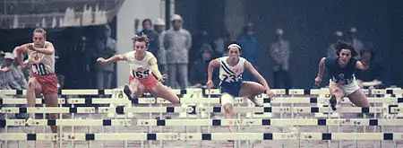 The women's 80 metres hurdles was the only women's hurdle race in the Athletics at the 1964 Summer Olympics program in Tokyo. It was held on 18 October and 19 October 1964.[1] 31 athletes from 20 nations entered, with 4 not starting the first round. The first round was held on 18 October, with the semifinals and final on 19 October. The 1965 film Tokyo Olympiad by Kon Ichikawa shows amazingly great detail of the preliminaries, preparation, final and medal ceremony surrounding this event. The slow motion study of the final shows Yoda Ikuko getting a fast start. Joining Ikuko in the lead is Teresa Ciepły. Rosie Bonds crashed the second hurdle and is awkward the rest of the race. By the third hurdle Pam Kilborn has overtaken Ikuko and Ciepły for the lead. Karin Balzer and Irina Press were close behind. Over the course of the final five hurdles, Balzer and Press edged closer as Ikuko lost a little ground. Ciepły, Kilborn and Balzer landing at virtually the same moment and Press inches behind. On the run in, Balzer was able to gain just enough ground to take the gold over a straining Ciepły.