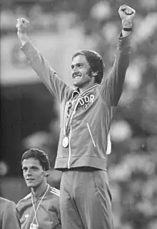 ![]() Waldemar Cierpinski, celebrating his gold medal. Left behind him Gerard Nijboer | ||||||||||