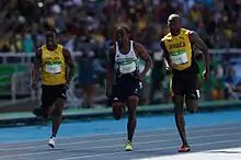 ![]() De Grasse, Bolt and Vicaut cross the finish line during the final of the Men's 100 metres | |||||||||||||