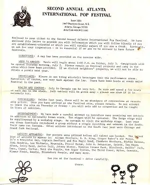 The second Atlanta International Pop Festival was a rock festival held in a soybean field adjacent to the Middle Georgia Raceway in Byron, Georgia, from July 3–5, 1970, although it did not finish until after dawn on the 6th.[1] It was the only successor to the first Atlanta Pop Festival, which had been held the previous summer near Hampton, Georgia. The event was promoted by Alex Cooley, who had helped organize the '69 Atlanta festival as well as the '69 Texas International Pop Festival, and two years later would promote the Mar Y Sol Pop Festival in Puerto Rico from April 1–3, 1972.