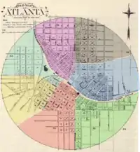 - Fifth Ward (purple) from Pryor and tracks north-east to Peachtree, then West Peachtree to city limits, south-west to Foundry and W&A RR and east to origin