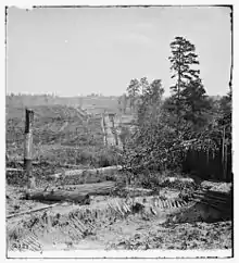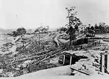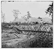 Captain Grant planned a series of 17 redoubts forming a 10-mile (16 km) circle over a mile (1.6 km) out from the center of town. These would be interlinked with a series of earthworks and trenches, along with rows of abatis and other impediments to enemy troops. Construction on the extensive defensive works began in August 1863. They were bounded on the north by high ground (the present location of the Fox Theatre), the west by Ashby Street, the south by McDonough Drive and the east by what is today known as Grant Park. Gilmer inspected the completed work in December 1863 and gave his approval.[11] Because of how the subsequent campaign unfolded, most of these fortifications were never really put to the test.[23][24]