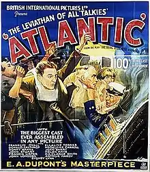 Atlantic (1929) (also known as Titanic: Disaster in the Atlantic for its home video release) is a British drama film directed and produced by Ewald André Dupont and starring Franklin Dyall and Madeleine Carroll.[1] Originally, two versions were made, the English and German-language version Atlantik were shot simultaneously. Subsequently, the production of a French version (Atlantis) began in spring 1930 using different footage and partially an altered storyline.[2] The fourth version was released as a silent film.