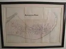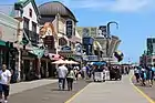 The first boardwalk was built in 1870 along a portion of the beach in an effort to help hotel owners keep sand out of their lobbies. Businesses were restricted and the boardwalk was removed each year at the end of the peak season.[32] Because of its effectiveness and popularity, the boardwalk was expanded in length and width, and modified several times in subsequent years. The historic length of the boardwalk, before the destructive 1944 Great Atlantic Hurricane, was about 7 miles (11 km) and it extended from Atlantic City to Longport, through Ventnor and Margate.[33]