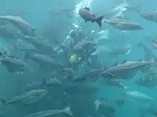 The exhibition area includes 11 larger landscape aquariums, including 2 open touch pools and 2 activity pools, plus several smaller aquariums. Together the aquariums provide a representative view of life under water along the Norwegian coast and in the northern Atlantic ocean.[4] Daily dive shows in the 4,000,000-litre (1,100,000 US gal) Great Atlantic tank let visitors watch the fish being fed.[6][7] Some of the species in this tank are cod, halibut, conger and salmon.[7] On weekends, visitors can help feed the fish in the open pools.[8] In 2014, the 15,000,000-litre (4,000,000 US gal) "Selbukta" opened, which is one of the largest seal exhibits in the world.[2] This outside exhibit houses harbor seals.[2]
