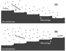 Figure 1(b) shows a similar situation, but this time with the substrate rotated by 180° so that the incident beam is now in the "uphill" direction, and nearly parallel to the surface. In this case, the step faces provide the bonding sites and the deposited material grows along the steps, similar to the step-flow growth mechanism.