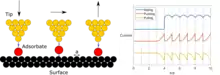 Depending on the tip apex and the surface/adsorbate system, the lateral motion can occur by pushing, pulling or sliding of the adsorbate. These modes result in distinct tunneling current signals during the lateral motion. For example, periodic steps in the tunneling current indicate that the adsorbate is “jumping” between adsorption sites while following the tip: this means the tip pushes or pulls the adsorbate.