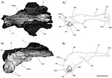 A study was done on the braincase of Aucasaurus in 2015 by Ariana Paulina-Carabajal and Cecilia Succar, in which the skull material was scanned using a medical CT machine. Virtual three-dimensional inner ear and cranial endocasts were obtained and visualized using the imagine software at the University of Alberta. A latex cranial endocast was also made. The forebrain, midbrain, and hindbrain resemble the morphology described for the abelisaurids Majungasaurus and Indosaurus. However, Aucasaurus exhibits a floccular process that is relatively larger than that of Majungasaurus. In Aucasaurus the flocculus is enclosed in an 8-shaped floccular recess, similar in shape and size to that observed in Abelisaurus, suggesting that the two Patagonian taxa were capable of a slightly wider range of movements of the head. The labyrinth of the inner ear is similar in shape and size to the semicircular canals of Majungasaurus, although the lateral semicircular canal is shorter in Aucasaurus.[8]
