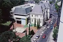 The main gallery building was originally designed by Melbourne architects Grainger & D'Ebro to house not only the art gallery but also the City Council offices, lecture theatre and public library. It is constructed of brick and plaster in an early French Renaissance style and was completed in 1887, with an extension built in 1916.[4] It is three storeys high, with an attic in the steep pitched roofs, and a six-storey clock tower. The building was registered as a Category I heritage item by Heritage New Zealand on 24 November 1983, listed with registration number 92.[5]