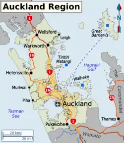 On the mainland, the region extends from the mouth of the Kaipara Harbour in the north across the southern stretches of the Northland Peninsula, past the Waitākere Ranges and the isthmus of Auckland and across the low-lying land surrounding the Manukau Harbour. The region ends within a few kilometres of the mouth of the Waikato River.[4] It is bordered in the north by the Northland Region, and in the south by the Waikato region. It also includes the islands of the Hauraki Gulf.
