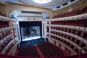 - Balconies or galleries: one or more raised seating platforms towards the rear of the auditorium. In larger theatres, multiple levels are stacked vertically above or behind the stalls. The first level is usually called the dress circle or grand circle. The highest platform, or upper circle is sometimes known as "the gods", especially in large opera houses, where the seats can be very high and a long distance from the stage.
