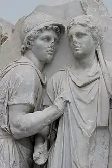 The earliest certain representation of Auge occurred on the frieze of the temple of Athena Alea at Tegea (finished c. 350–340 BC).[52] Inscriptions show that Auge and Telephus were represented on the metopes of the temple.[53] Pausanias mentions seeing a portrait painting of Auge at the same temple.[54] Also at Tegea, Pausanias, describes an image of Auge on her knees, at the temple of Eileithyia, the goddess of childbirth.[55] According to the Tegeans it was at this place that Auge "fell on her knees" and gave birth to Telephus, while she was being taken to the sea by Nauplius.