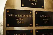 Despite his notable successes (such as bombarding Cattaro and occupying the Dalmatian Islands[1]), the sinking of the armoured cruiser Léon Gambetta, torpedoed by Austro-Hungarian submarine U-5, elicited his resignation on 10 October 1915 without any public explanation. He was replaced by Admiral Dartige du Fournet. Placed in the reserve in 1916, he retired to Lectoure. He was granted the Grand Cross of the Légion d'honneur in April 1921. Admiral Boué de Lapeyrère lived until 1924, when he died at the age of 72, in Pau. His body was transferred to Les Invalides in Paris, France in 1931, he is buried in the 8th arcade of the crypt: Caveau des Gouverneurs, located under the Eglise de Saint-Louis des Invalides.