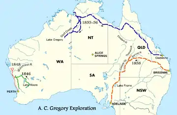 Sir Augustus Charles Gregory KCMG[1] (1 August 1819 – 25 June 1905) was an English-born Australian explorer and surveyor. Between 1846 and 1858 he undertook four major expeditions. He was the first Surveyor-General of Queensland. He was appointed a lifetime Member of the Queensland Legislative Council.