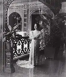 Time described Aurora as "dignified and portly".[10] The Quezons were the first presidential couple to reside in Malacañan Palace, but she spent as little time as possible there, preferring to stay in a "nipa house" in Malacañang Park or in her farm, Kaleidan, in Arayat, Pampanga. She nevertheless was an active First Lady, engaging herself in the campaign to give Filipino women the right of suffrage, which was achieved in 1937. She was particularly involved in managing the family's Arayat farm to demonstrate how social justice could be applied to landlord-tenant relationships in an agrarian setting. She was involved in the Girl Scouts of the Philippines and the Associación de Damas Filipinas, a noted orphanage in Manila.[8] She was also the honorary president of another orphanage, the White Cross, located in San Juan.