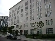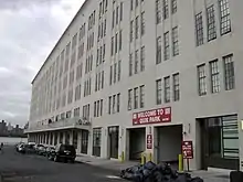 The reinforced concrete facade is relatively simplistic and painted in shades of white.[18][51] The facade is divided into numerous architectural bays, which generally contain groupings of three narrow, slightly-recessed windows on each floor.[50][51] The western facade is divided into eight bays, all of which contain 3 windows on each floor, except for the southernmost bay, which only contains 2 windows. The eastern facade is divided into nine bays; the northernmost and southernmost bays contain 2 windows while the remaining seven bays contain 3 windows. A similar pattern can be found on the longer northern and southern facades, where most of the bays contain 3 windows, while the end bays and two of the center bays contain 2 windows. Loading docks, now sealed, were located on the western, northern, and southern facades.[50]