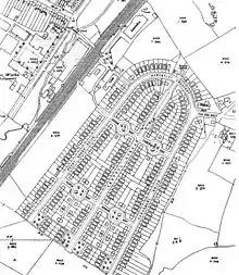 Herbert Austin, who created the Austin Motor Company at Longbridge in 1905, had to take on more workers during the First World War when his factory became involved in making tanks and aircraft. In 1917, he built a new estate for his employees in Turves Green on land bought for £7,750.[1] He imported 200 red cedar wood pre-fabricated bungalows from the Aladdin Company, Bay City, Michigan, USA.[1] They were shipped across the Atlantic and survived potential loss by U-boat attack. These were erected with twenty-five conventional brick-built semi-detached houses at intervals to create firebreaks.[1] They were fitted with coke-fired central heating, gas cooker, gas water boiler, sink and drainer, and a bathroom with bath.[2] The external size of the bungalows was 6.84 yards (6.25 m) wide by 11.75 yards (10.74 m) deep with an additional porch at the front and boiler room at the rear. The three bedrooms were each 9 feet 7 inches (2.92 m) square.[2] The brick houses were also fitted with two gas fires.[2]