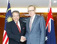 In April 2005, Malaysian Prime Minister Abdullah Ahmad Badawi made an official visit to Australia. Other Malaysian ministers undertook separate bilateral visits in the same year including the Minister of Human Resources Fong Chan Onn, Minister of Higher Education, Shafie Salleh, Minister of Environment and Natural Resources, Adenan Satem and Minister of Transport Chan Kong Choy.[7] The following year, Minister of Agriculture and Agro-based Industries Muhyiddin Yassin visited Australia in March 2006 to remove barriers in the halal beef export trade to Malaysia with the signing of memorandum of understanding (MoU) on agricultural co-operation with Australian counterpart Peter McGauran.[7] Malaysian Minister of Foreign Affairs Syed Hamid Albar visited Australia from 1–8 June 2006 and Minister of International Trade and Industry Rafidah Aziz visited from 31 July–8 August 2006 to attend the 13th Australia-Malaysia Joint Trade Committee meeting and to run a series of Malaysia trade promotion seminars.[7] From the Australian side, Australia's Attorney-General, Philip Ruddock, Minister for Veterans’ Affairs De-Anne Kelly, Minister for Agriculture, Fisheries and Forestry Warren Truss and Minister for Education, Science and Training Brendan Nelson undertook separate bilateral visits to Malaysia in 2005, while Deputy Prime Minister and Minister for Trade Mark Vaile visited the country in August 2005.[7] In July 2008, Australian Prime Minister Kevin Rudd visited Malaysian Prime Minister Abdullah Ahmad Badawi.[19] On 4 November 2012, following the visit made by Australian Foreign Minister Bob Carr, the two countries agreed for a joint Australia-Malaysia cultural exchange program for young Australians and Malaysians to travel to each other's countries and develop a stronger understanding of each other cultures and faiths.[20]