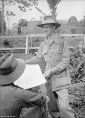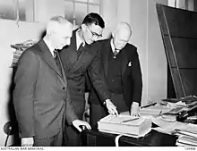 ![]() A. G. Butler (right), Gavin Long (centre) and Allan S. Walker (left) discuss a manuscript in the Australian War Memorial library in 1945 | |
