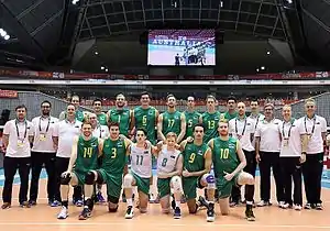 The Australia Men's national volleyball team, also known as Volleyball Team Australia Men (VTAM) or the Volleyroos, is the national volleyball team of the volleyball-playing nation of Australia. As of August 2015, they are ranked 13th in the world.[1] They are a member of the Asian Volleyball Confederation (AVC). Their best result came in 2007, when they won the Asian Men's Volleyball Championship.