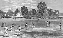 On Boxing Day 1866, in front of over 10,000 spectators, Wills captained the team against the Melbourne Cricket Club at the Melbourne Cricket Ground. Bell's Life in Victoria reported: "Seldom has a match created more excitement in Melbourne than the one under notice, and never within our recollection has a match given rise to so much feeling on behalf of the spectators."[3] "The veteran Wills never captained an eleven who so thoroughly possessed the sympathies of the spectators," wrote a Melbourne correspondent for The Sydney Mail. "A dark skin suddenly became a passport to the good graces of Victorians."[4] Although they lost to the MCC, the Aboriginal players were commended for their performance, and showed marked improvement on a subsequent tour of country Victoria.