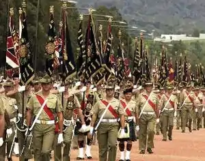 Infantry, and some other combat units of the Australian Army carry flags called the Queen's Colour and the Regimental Colour, known as "the Colours".[61] Armoured units carry Standards and Guidons – flags smaller than Colours and traditionally carried by Cavalry, Lancer, Light Horse and Mounted Infantry units. The 1st Armoured Regiment is the only unit in the Australian Army to carry a Standard, in the tradition of heavy armoured units. Artillery units' guns are considered to be their Colours, and on parade are provided with the same respect.[62] Non-combat units (combat service support corps) do not have Colours, as Colours are battle flags and so are only available to combat units. As a substitute, many have Standards or Banners.[63] Units awarded battle honours have them emblazoned on their Colours, Standards and Guidons. They are a link to the unit's past and a memorial to the fallen. Artillery do not have Battle Honours – their single Honour is "Ubique" which means "Everywhere" – although they can receive Honour Titles.[64]