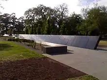 Approximately 130 metres (430 ft) long, the memorial features a long pathway of light-grey basalt pavers cut to resemble railway sleepers, reminiscent of those used on the Thai–Burma Railway.[2] To the southern side are two canted black polished granite walls with the names of all known Australian prisoners of war. They are listed alphabetically by war and no rank is acknowledged. The two walls are separated in the middle by a square pool of water that features six large basalt obelisks. These feature the names of the countries where Australian POWs were held. The obelisks centralised in the pool of water symbolise the Australian POWs being cut off and isolated from their homeland by the ocean.[2] The sixth obelisk is deliberately toppled on its side and broken, symbolising "The Fallen".