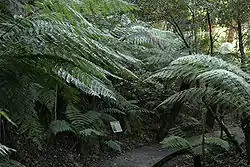 The area is located on the north-eastern side of Black Mountain and consists of steep to gently sloping hillsides cut by several gullies. The setting is within dry sclerophyll woodland dominated by Eucalyptus Rossii, E. Mannifera ssp Maculosa and E. Macrorhyncha. Soils in the area are predominantly red/yellow earths and red earth/ red podsolic soils with associated lithosols and siliceous sands. The Gardens comprise sections devoted to different taxonomic plant groups and ecological themes focussed on Australian native plants. The site is crossed by a network of paths which wind amongst the various garden beds. Areas of native bushland are still present on the site. One area on the upper slopes had been developed as a nature trail. Special features within the Gardens include the eucalypt lawn, rockery, rainforest gully, mallee shrubland, Hawkesbury sandstone and the Aboriginal trail. The rainforest area has been developed in what was previously a dry gully and has been planted to represent the eastern coast of Australia: Tasmanian species occupy the lower end of the gully and Victorian, New South Wales and Queensland species in sequence moving up the gully. The proposed conservatory at the upper end will allow the cultivation of tropical species. The Gardens are used as an education centre from primary to tertiary levels including horticultural and taxonomic training. They are also important for scientific research into the taxonomy, horticulture and biology of native plant species. The living collections are particularly important for this function. A large number of rare and endangered plant species are also included in the living collections, thus ensuring the preservation of their genotypes and allowing some protection through cultivation. Due to the mature vegetation and a wide range of habitats present in the area, over 100 native and exotic bird species have been recorded from the Gardens.[2]