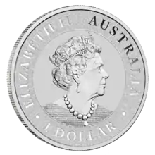 The Silver Kangaroo is a silver coin originating from Australia and produced at the Perth Mint. This is a bullion coin meant for investment in silver. An Australian silver kangaroo coin, produced at the Royal Australian Mint (RAM), is collected for its numismatic value. The obverse of the coin always depicts Queen Elizabeth II. The reverse side features a red kangaroo jumping. Unlike the Australian silver koala and silver kookaburra coins, the reverse image does not change every year. The obverse image on the RAM silver coin does change every year. The mintage every year is unlimited, unlike the koala and kookaburra coins which have a maximum mintage of 300,000 and 500,000 respectively.[1] No special editions or privy marks have appeared for the one-ounce bullion coin.[2]